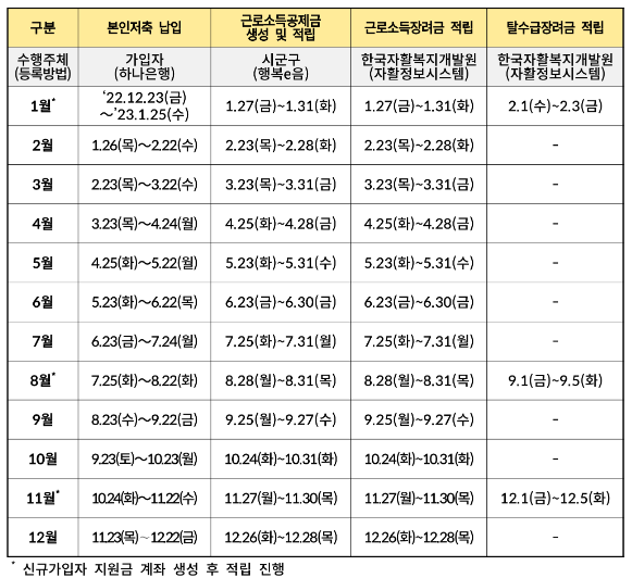- 내일키움수익금 : 청년내일저축계좌 가입자가 자활정보시스템에 등록하여, 전월에 12일 이상 자활을 참여하고, 본인 저축액 월 10만 원 이상 적립 시, 최대 월 15만 원을 지원받습니다.