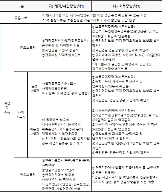 재직증빙이나 사업증빙 중 하나를 선택하거나, 소득증빙을 준비할 경우, 현재 3개월 이상 재직하거나 사업을 영위하거나, 1회 이상 연금수령을 확인할 수 있는 서류가 필요합니다.