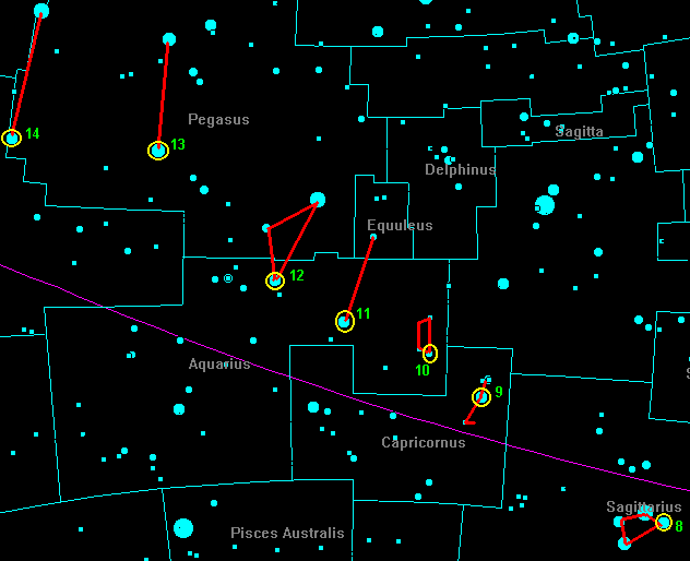 - 밤하늘 쪽: 사수자리(Sagittarius), 염소자리(Capricornus) 쪽 일부