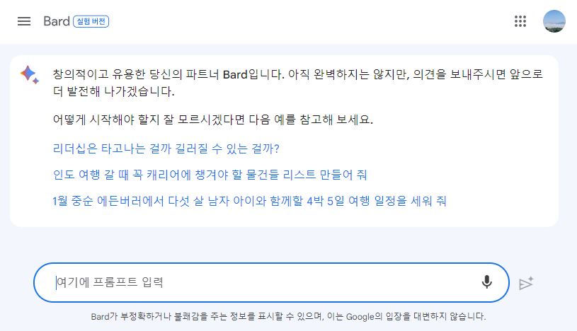처음 Bard 바드가 나왔다는 소식을 들었을 때 곧바로 구글 바드에 접속했지만 한국에서는 사용할 수 없었습니다. 귀하의 나라에서는 아직 서비스하지 않는다는 메시지만 볼 수 있을 뿐이었습니다. 그다음에는 영문으로라도 사용할 수 있게 오픈되기는 했지만, 아무래도 직관적으로 쓰기가 쉽지 않았습니다. 그런데 이제는 곧바로 바드를 사용할 수 있게 되었습니다. 구글에서 google bard라고 검색하면 바로 bard.google.com에 접속되고, 영어 외에 한국어와 일본어가 가능합니다. (2023.5.10 google I/O 발표) 그리고 곧 40개 언어로 확대할 예정입니다.
