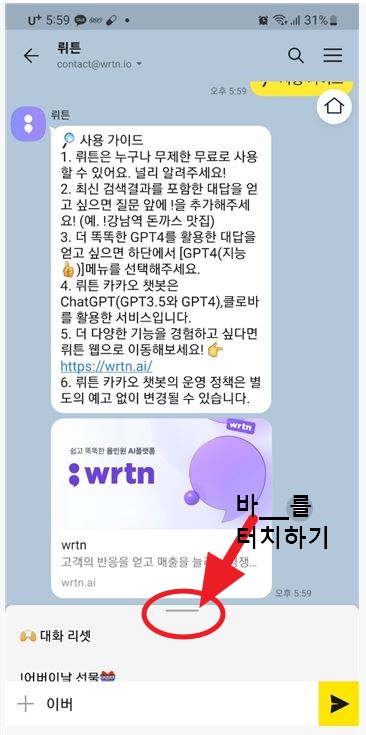 9. 뤼튼 채팅방 아래쪽에 바"____"가 보이면 클릭해 보세요. 많은 메뉴들이 있습니다.