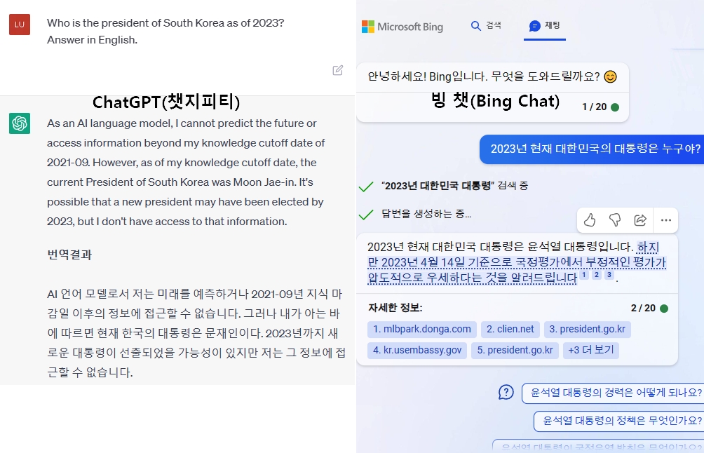 예제를 보여드리겠습니다. "2023년 한국의 대통령은 누구야?"를 챗지피티와 빙챗에 각각 물어보았습니다. 그 결과는 아래와 같습니다. 챗지피티는 2021년0월까지 정보까지만 가능하기 때문에 알 수 없다고 하였고, 빙 챗은 검색을 동시에 진행하여 최신 정보를 알려주었습니다.
