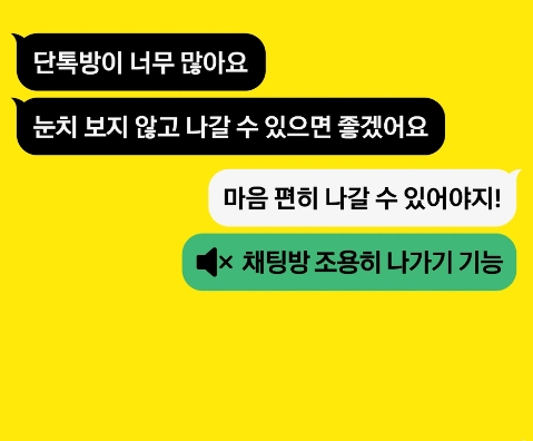 '채팅방 조용히 나가기'기능으로 이제 채팅방을 나가더라도 'OOO님이 나갔습니다'라는 메시지가 표시되지 않는 만큼 참여자들의 부담이 크게 줄어들고 스트레스가 감소할 것으로 전망하고 있습니다.