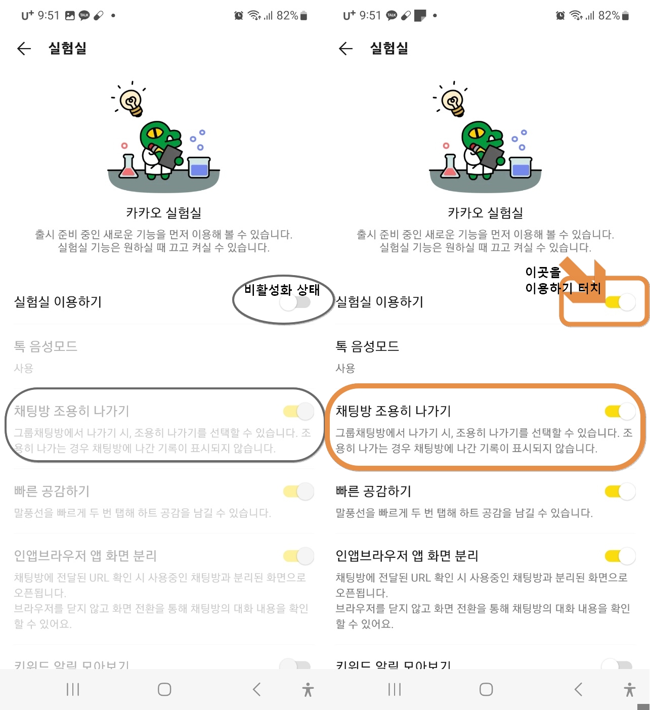 2. "실험실 이용하기"가 설정되어 있지 않으면 "채팅방 조용히 나가기" 기능을 사용할 수 없습니다.