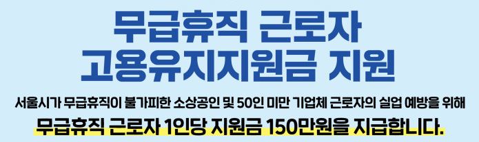 서울시가 무급휴직이 불가피한 소상공인 및 50인 미만 기업체 근로자의 실업 예방을 위해 무급휴직 근로자 1인당 지원금 150만원을 지급합니다.