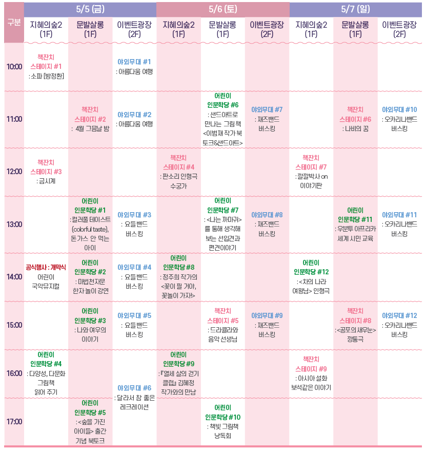 개막식, 책놀이터(북마켓 및 체험전시), 캠페인존(체험전시부스), 책잔치스테이지(음악, 연극 등 공연들), 테마전시, 어린이 인문학당(작가와의 만남, 북토크 등), 온오프라인 이벤트 등이 있습니다.