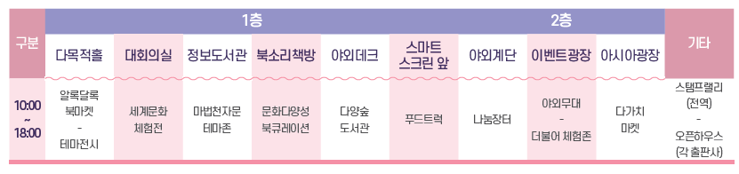 아시아출판문화정보센터 1F, 2F의 각종 홀에서 진행합니다. 프로그램표를 참고하세요.