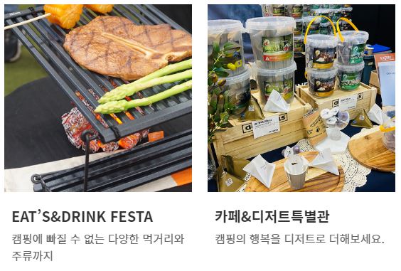 캠퍼들의 캠핑즐거움 중에 빼놓을 수 없는 것이 바로 먹방! 나만의 캠핑을 즐기는 트렌드로 완전히 변화하면서 다양한 캠퍼들의 취향을 저격하는 다양하고 맛있는 캠핑음식들을 선보입니다. 캠핑 특성상 빠르고 간편하게 먹을 수 있어야 하지만 맛이 꼭 있어야 하지요! 캠퍼들을 위한 밀키트부터 캠핑의 하이라이트 바비큐와 각종 주류까지 가장 최신의 음식들을 볼 수 있습니다.