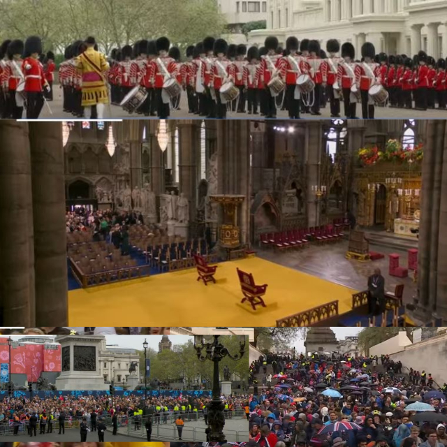 - 거리 행진 : BST10:20(KST 저녁 6:20) : 국왕과 왕비는 버킹엄 궁전을 출발하여 몰과 화이트홀을 지나 의회거리를 따라 의회 광장의 동쪽과 남쪽을 돌아 웨스트 민스터 사원의 그레이트 웨스트 도어에 도착합니다. 약 2.29km의 거리를 행진합니다.